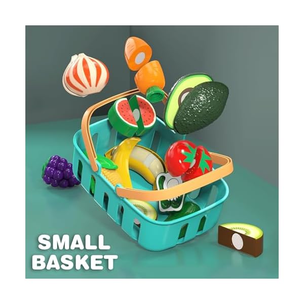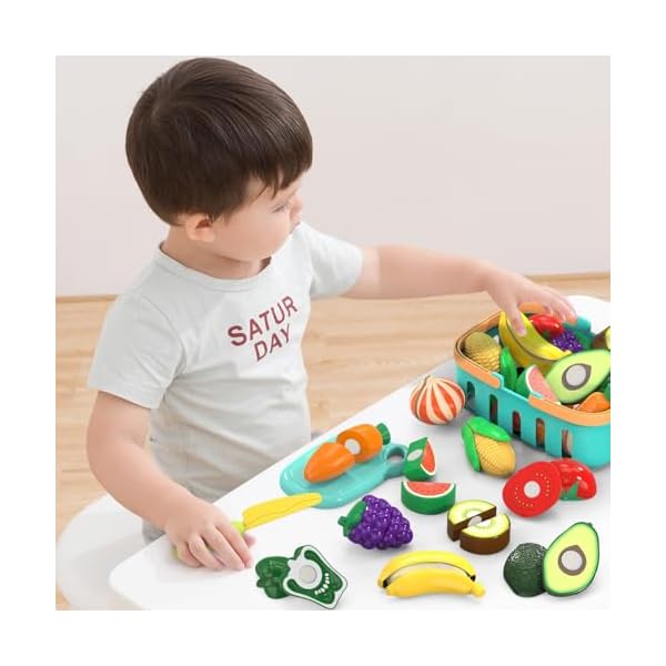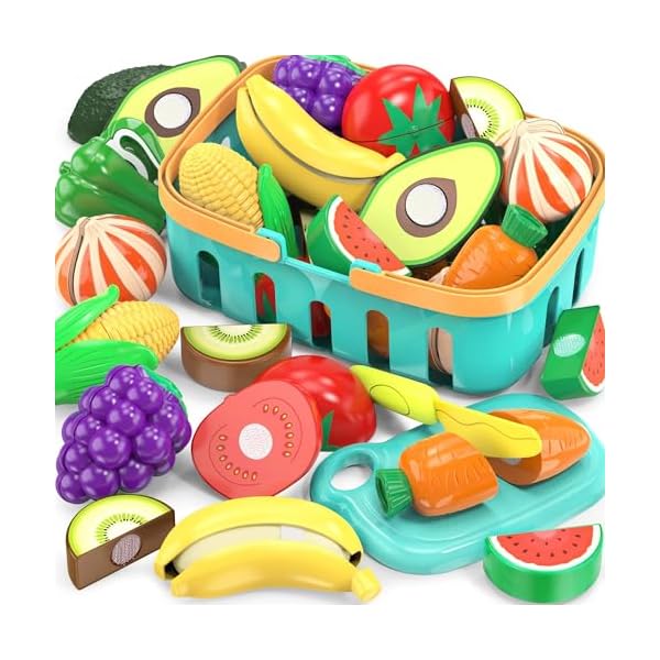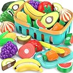 This 28-piece cutting play food set includes fruits and vegetables, a shopping basket, chopping board, and safe plastic knife—designed for imaginative kitchen play while teaching shapes, colors, and hand-eye coordination.
