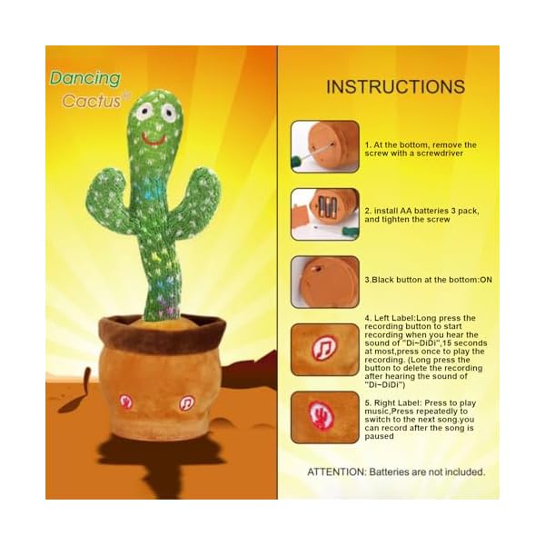SINGING CACTUS TOY:This sing dancing cactus toy for young children is made of secure plush fabric, soft and comfortable, suitable for children to play with. Cactus mimicking toy interactive baby toys comply with international children’s toy safety standards and may also be played with peace of mind