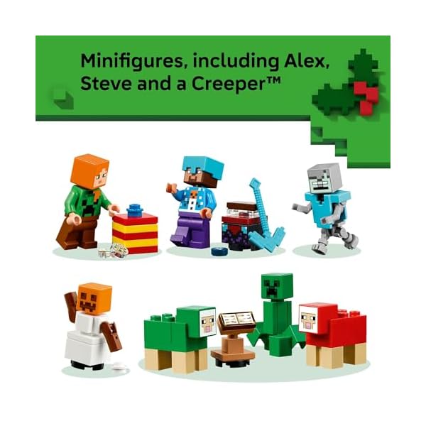 This set also includes 8 iconic Minecraft minifigures, including Steve, Alex, a Creeper, and special holiday-themed characters. Children can mix and match the pieces to create imaginative winter scenes or add them to their existing Minecraft LEGO collections.