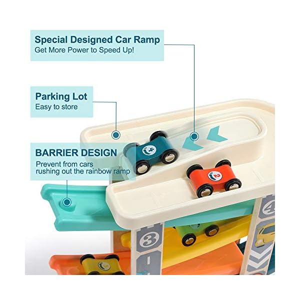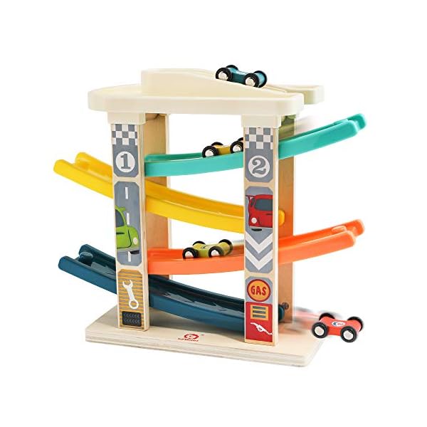 Offers multiple height levels so cars descend through zig-zag paths, teaching basic physics and cause-effect.