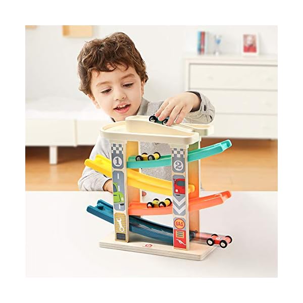 Let toddlers delight in watching cars zoom down ramps with this wooden car ramp race track toy. Includes 4 mini cars, multi-level tracks, and a garage. Ideal for ages 1–3 to build motor skills and curiosity.